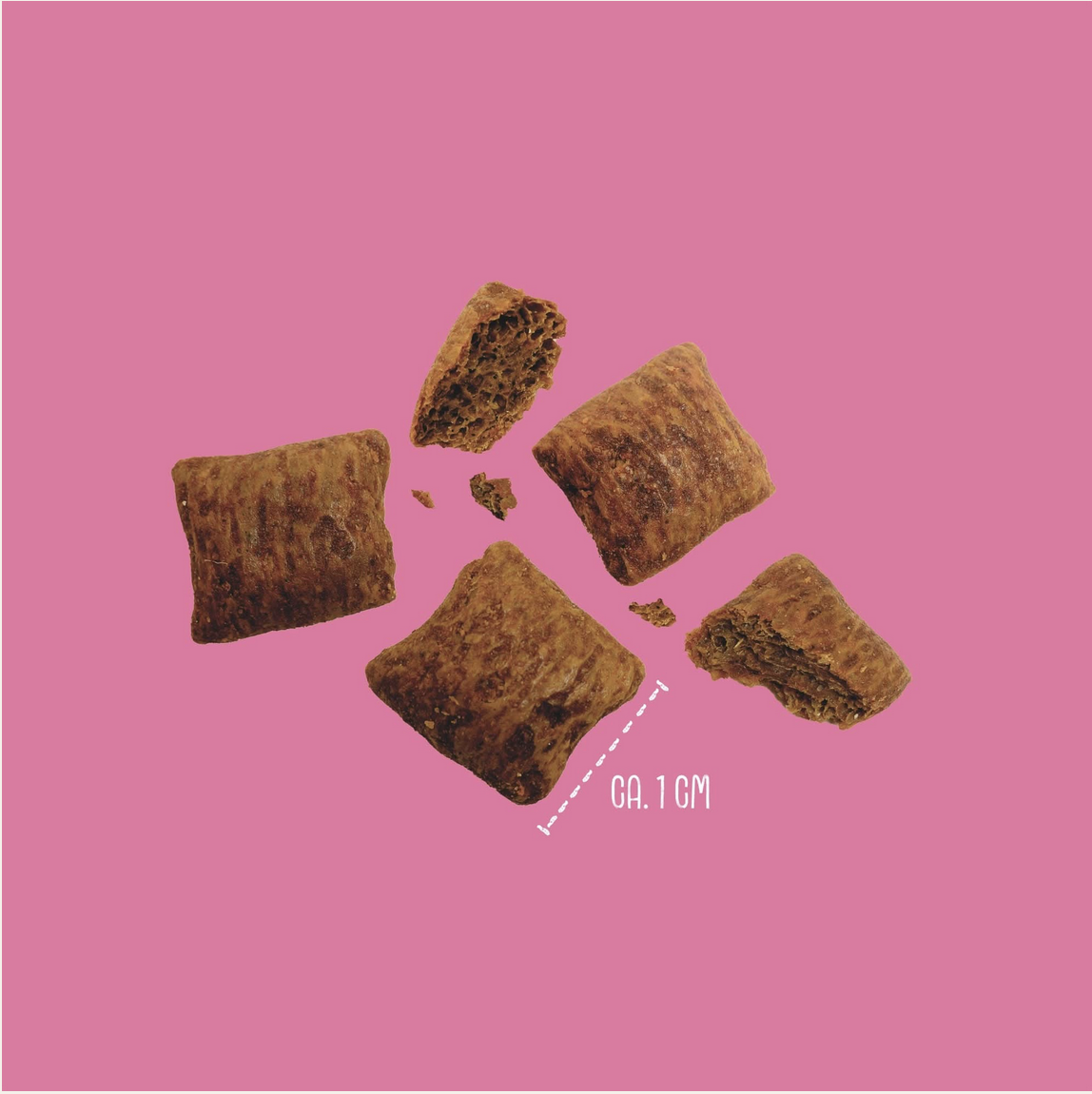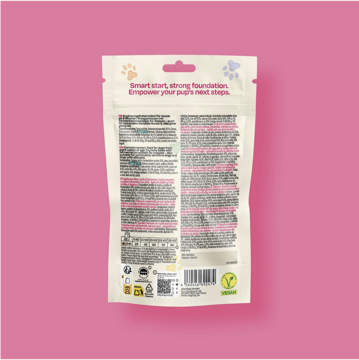 Snacks veganos en tamaño mini, perfectos para entrenamiento y para acompañar a tu compi desde cachorro hasta adult@. Con proteína de fermentación i aceite de algas (3%) como fuente de ácidos grasos clave para apoyar la salud y el desarrollo cerebral. Menos de 1kcal por pieza. Apto para perros con alergias. Disponible en sobres de 80g.