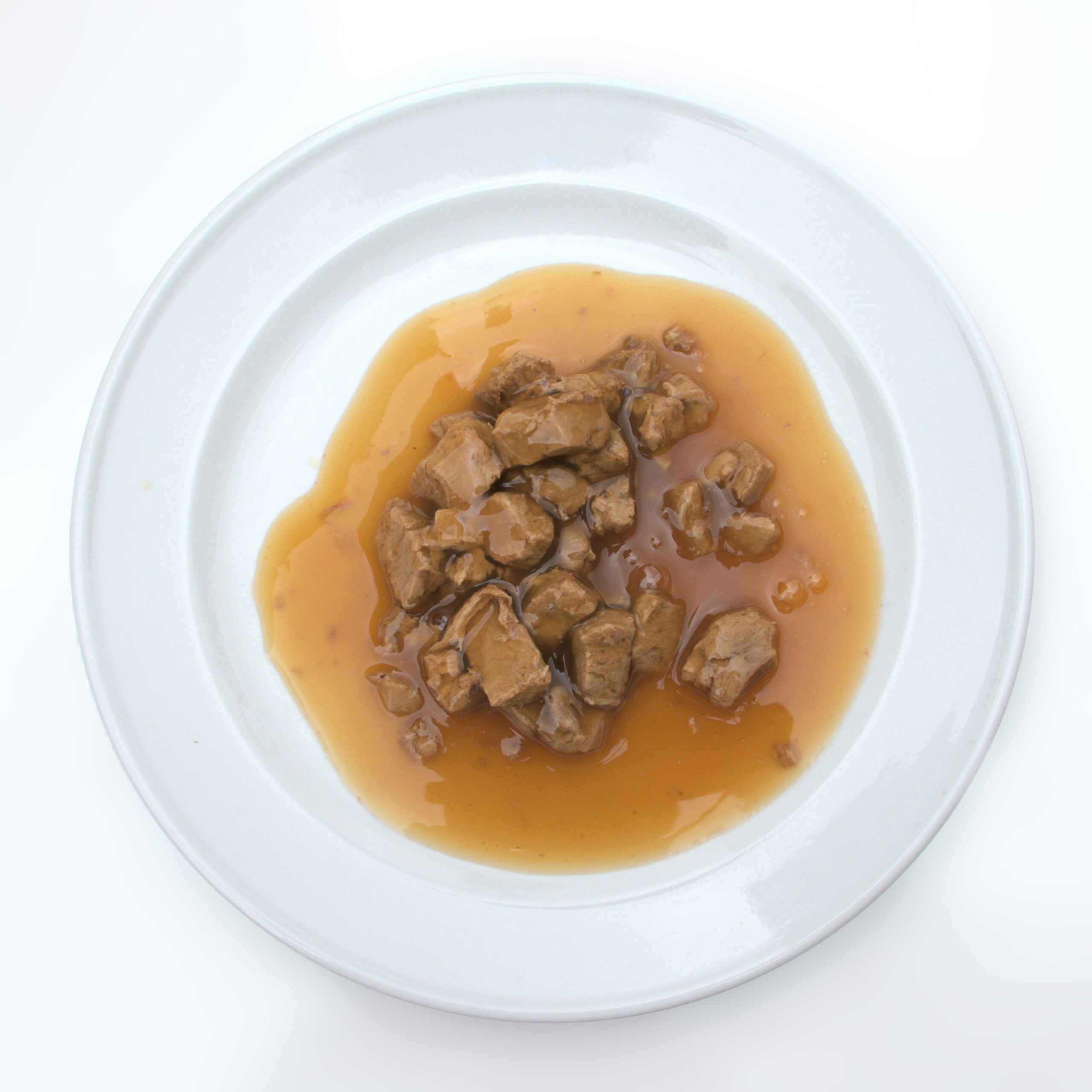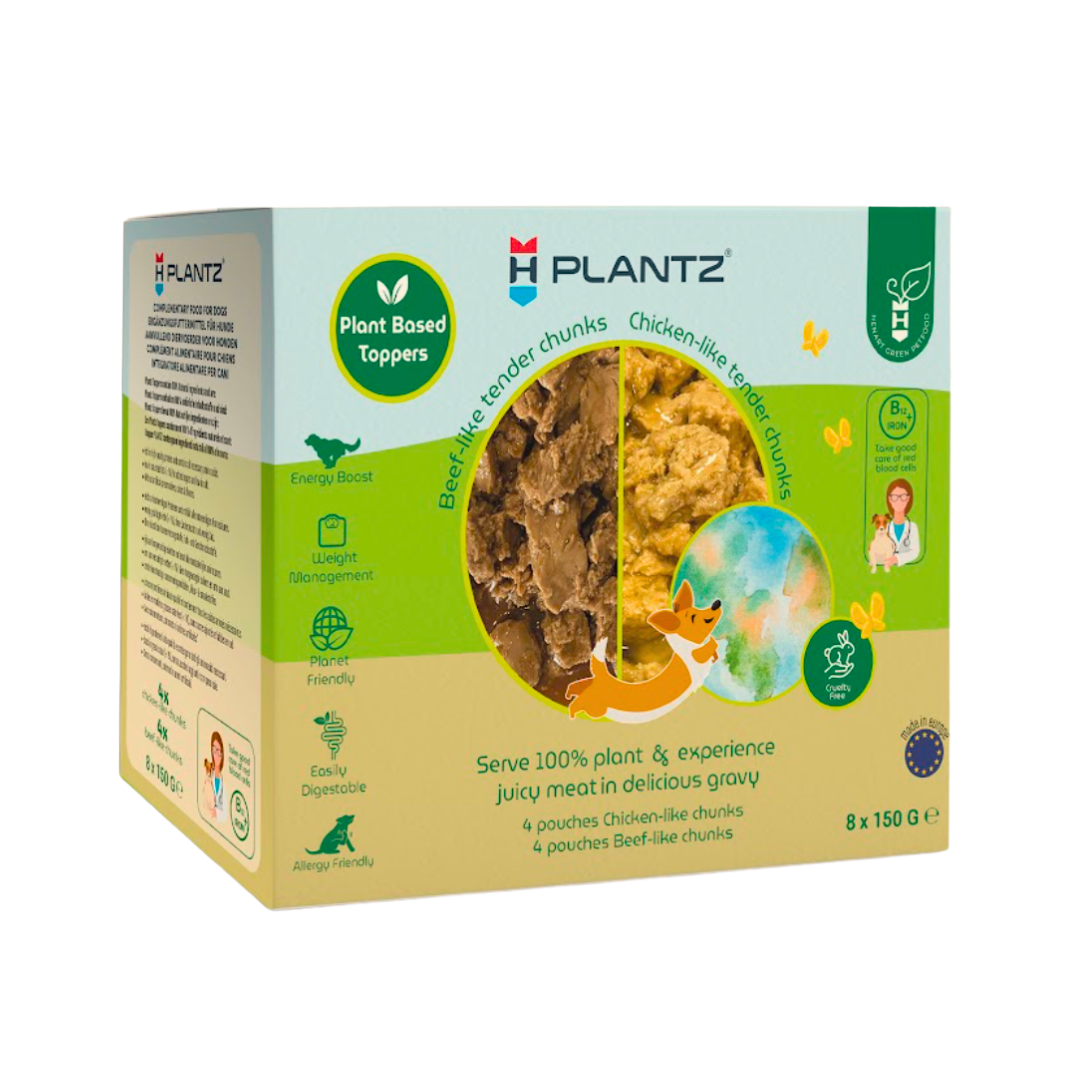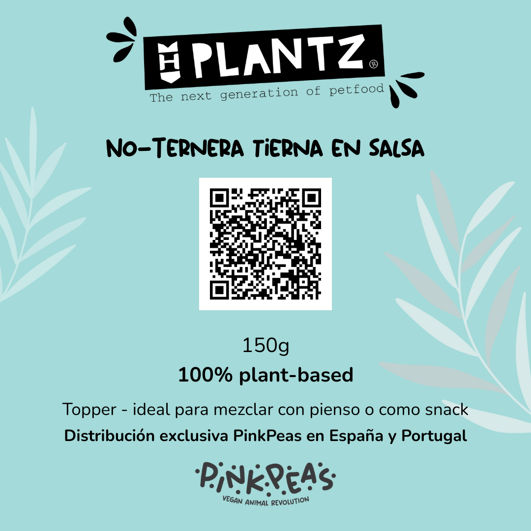 Topper de NO-TERNERA EN SALSA es la versión más caldosa y en formato pequeño de la línea húmeda PLANTZ. Ideal para añadir sobre el pienso o para usar como premio húmedo tanto para perros como para gatos. Es una receta complementaria, muy palatable y tierna con la textura carnosa original PLANTZ. Disponible en sobres de 150g.