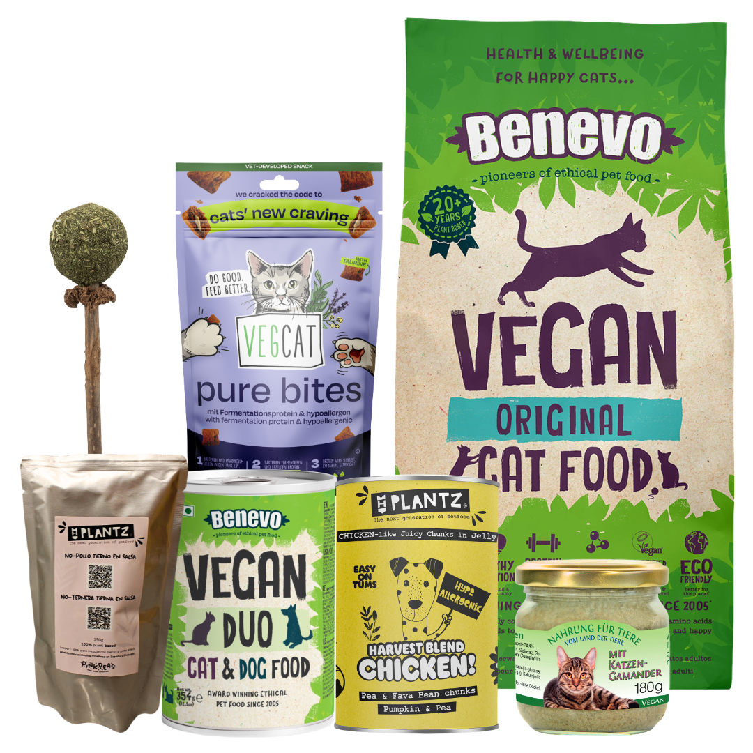Contiene 1 saco Benevo de 2kg, 1 lata de 354g de Benevo Duo, 1 lata de 400g de No-Pollo en gelatina Plantz, 1 tarro de 180g de comida húmeda con hierba gatera, 1 sobre de snacks VegCat, 1 topper de No-Ternera en salsa Plantz y 1 piruleta de matatabi.