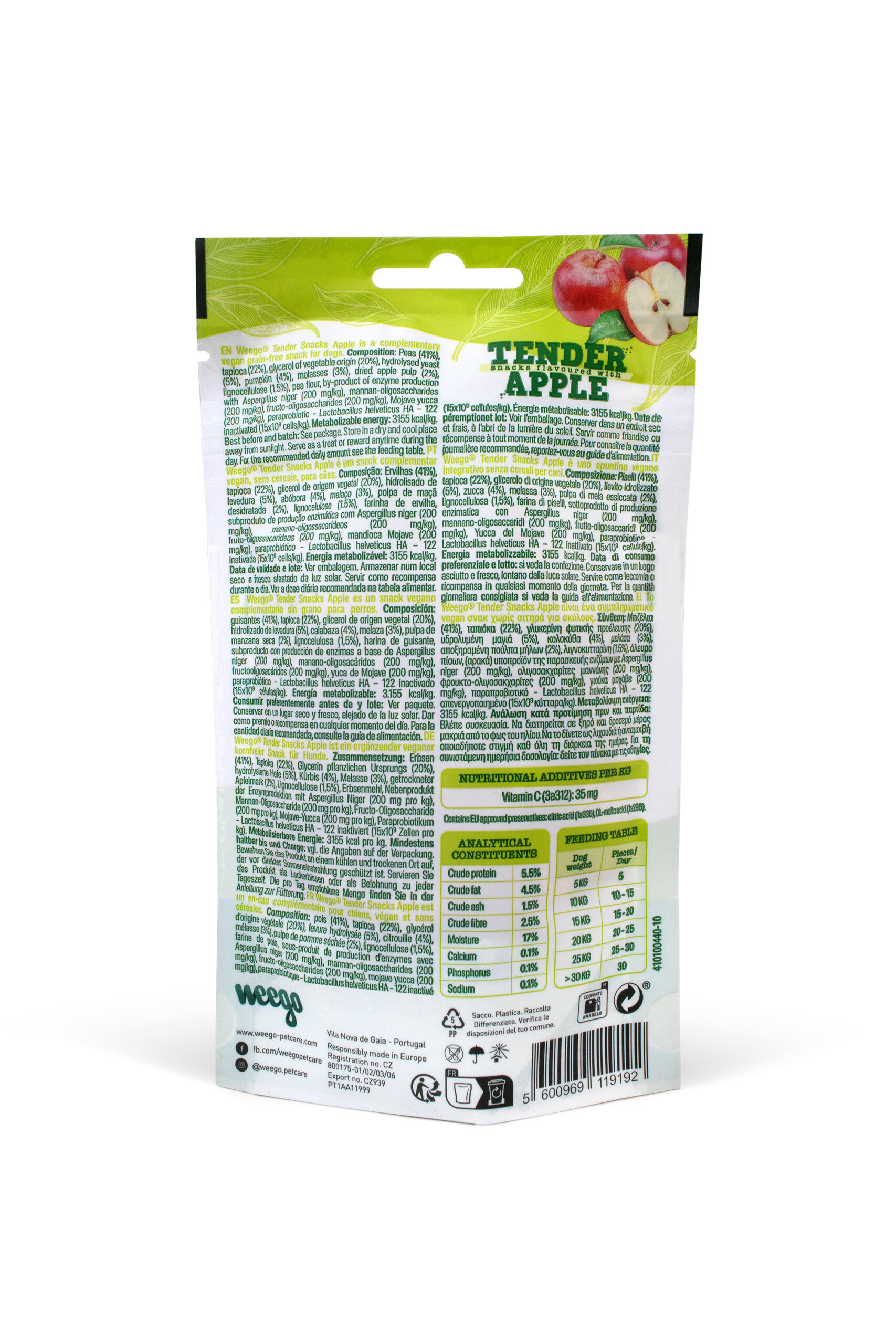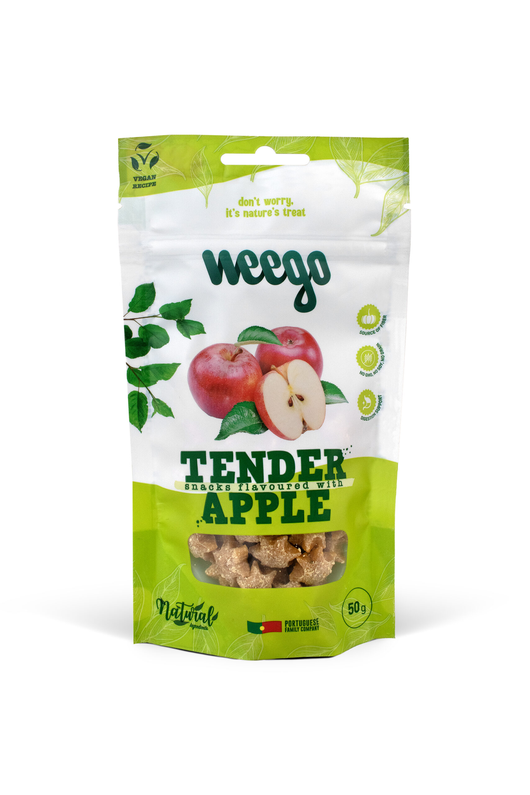 Los Tender snacks de Manzana forman parte de la línea hipoalergénica y vegana de WEEGO. Estos pequeños snacks semihúmedos están libres de soja y cereales, pero llenos de sabor a fruta. Son fáciles de digerir y, gracias a su selección de ingredientes con un gran contenido en fibra y paraprobióticos, apoyan el buen funcionamiento del tránsito intestinal.